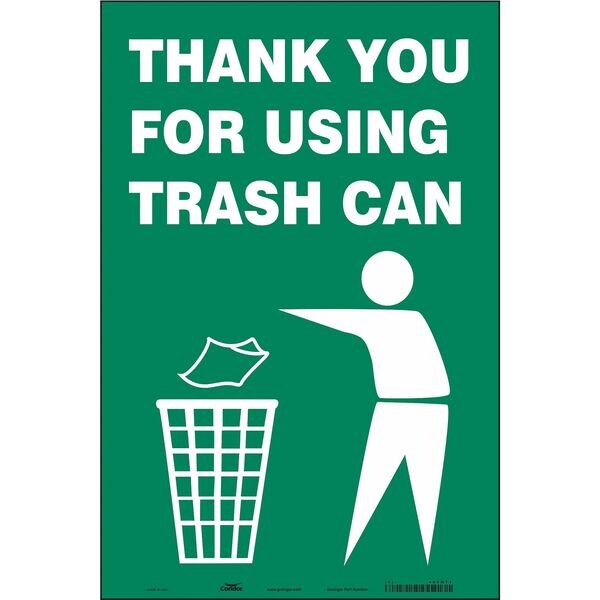 Safety Sign, Vertical Rectangle, Number of Printed Sides 1, English, Sign Legend Thank You For Using Trash Can, Sign Legend Background Color Green, Sign Legend Style Symbol and Text