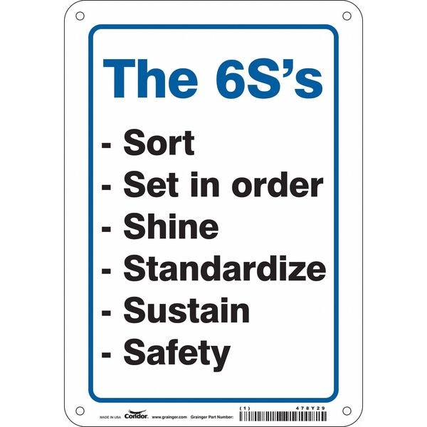 Safety Sign, Horizontal Rectangle, Number of Printed Sides 1, English, Sign Format Other Format, Sign Legend The 6S'S -Sort -Set In Order -Shine -Standardize -Sustain -Safety, Sign Legend Background Color White, Sign Legend Style Text