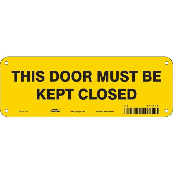 This Door Must Be Kept Closed, 10 in W x 3 1/2 in H, Vertical Rectangle, Aluminum, 471W49