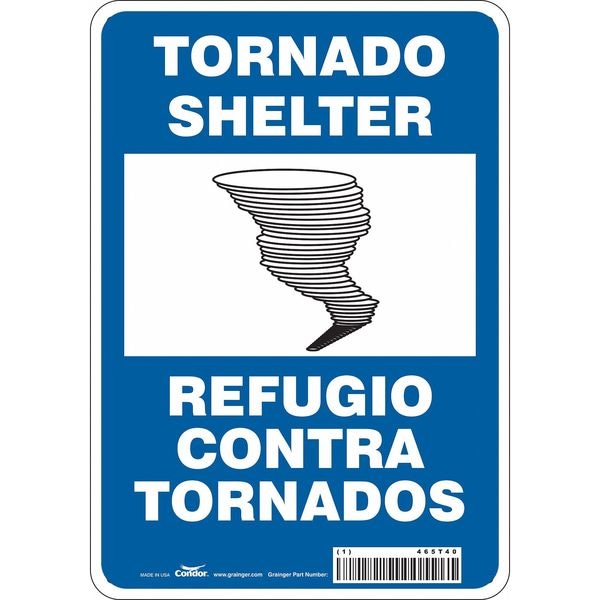 Safety Sign, Horizontal Rectangle, Number of Printed Sides 1, English, Sign Legend Tornado Shelter / Refugio Contra Tornados, Sign Legend Background Color Blue, Sign Legend Style Symbol and Text
