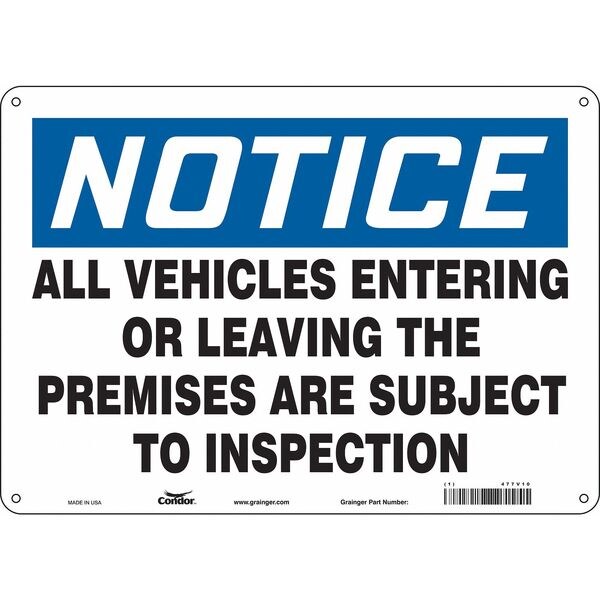 Traffic Sign, Horizontal Rectangle, Number of Printed Sides 1, English, Sign Format Traditional OSHA, Sign Legend All Vehicles Entering Or Leaving The Premises Are Subject To Inspection, Sign Legend Background Color White, Sign Legend Style Text