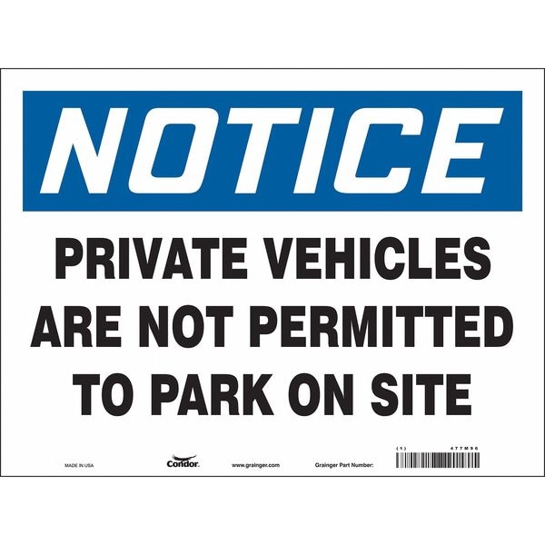 Traffic Sign, Horizontal Rectangle, Number of Printed Sides 1, English, Sign Format Traditional OSHA, Sign Legend Private Vehicles Are Not Permitted To Park On Site, Sign Legend Background Color White, Sign Legend Style Text