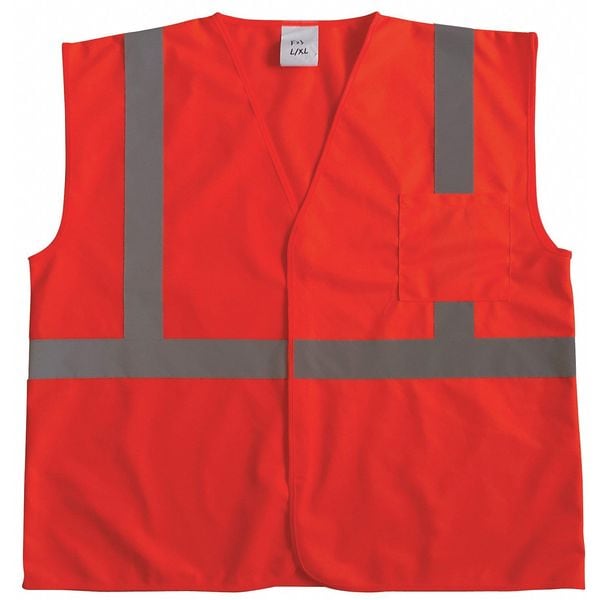High-Visibility Vest, ANSI Class 2, Vest Size L, XL, Traffic Safety Vest Color Orange/Red, Fits Chest Size 44 in to 50 in, Gender Men's, Stripe Color Silver, Vest Material Polyester, Vest Closure Type Hook-and-Loop, ATPV Rating Not Rated, Hazard Risk Category (HRC) Not Applicable, Vest Stripe Color Family Silver, Back Stripe Pattern U, Vest Length 28 in, Number of Pockets (Inside) 0, Number of Pockets (Outside) 1, Number of Pockets with Closure 0, Features 360 Degrees Visibility