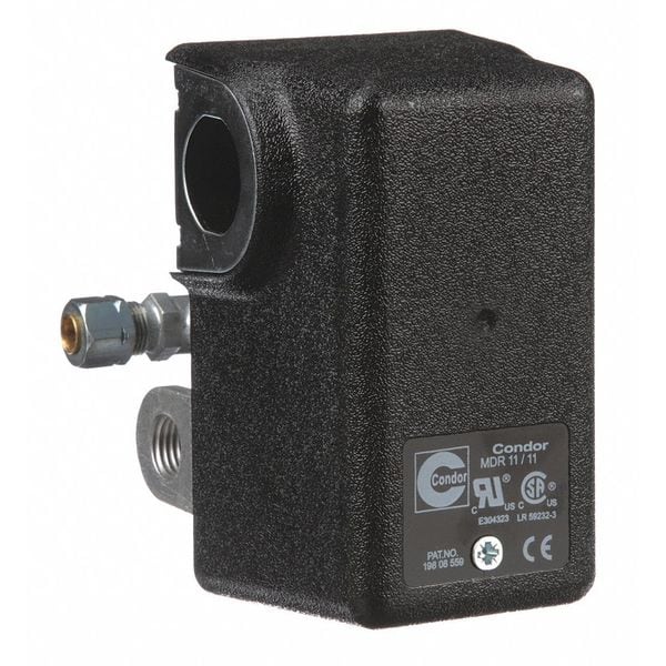 Pressure Switch, Air Compressor, Manual Switch Action None, (4) Port, 1/4 in FNPT, Pressure Switch Factory On/Off Setting 80/100 psi, 1/4 in Compression Pressure Switch Unloader, Pressure Switch Differential 20 to 45 psi, Pressure Switch Range 20 to 105 psi, Pressure Switch Electrical Contact Form DPST, Pressure Switch Action Standard, NEMA Rating 1, Series MDR11, HP @ 1 Phase - 120V 2 hp, HP @ 1 Phase - 240V 3 hp, Temp. Range -22 Degrees to 257 Degrees F, Standards CSA Certified, UL Listed