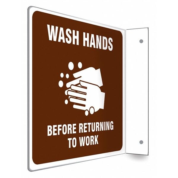 High Visibility Safety Sign, L-Shape Projection, Number of Printed Sides 2, English, Sign Legend Wash Hands Before Returning To Work, Sign Legend Background Color Brown, Sign Legend Style Symbol and Text
