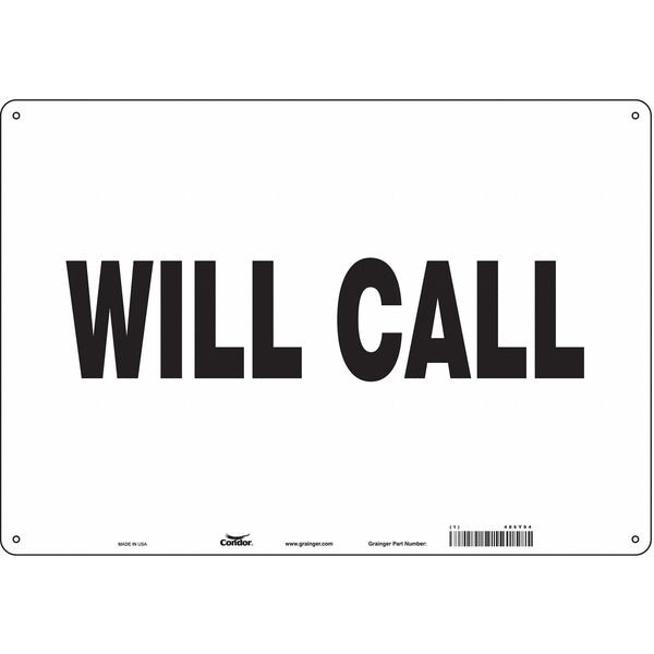 Safety Sign, Horizontal Rectangle, Number of Printed Sides 1, English, Sign Legend Will Call, Sign Legend Background Color White, Sign Legend Style Text