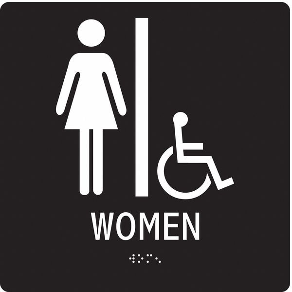 Safety Sign, Square, Number of Printed Sides 1, English, Sign Legend Women, Sign Legend Background Color Black, Sign Legend Style Symbol and Text
