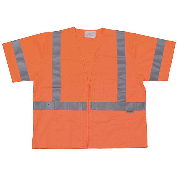 High Visibility Vest, ANSI Class 3, Vest Size XL, Traffic Safety Vest Color Orange/Red, Fits Chest Size 52 in, Gender Men's, Stripe Color Silver, Vest Material Polyester, Vest Closure Type Zipper, ATPV Rating Not Rated, Vest Stripe Color Family Green/Yellow/Silver, Back Stripe Pattern U, Vest Length 24 in, Number of Pockets (Inside) 3, Number of Pockets (Outside) 2, Number of Pockets with Closure 0, Features 360 Degrees Visibility, Standards Meets ANSI-ISEA 107-2004