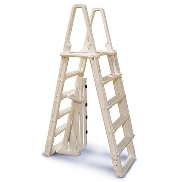 This economical yet full-featured white A-Frame ladder is great for non-deck above ground pool applications. Our A-Frame ladder provides a safe and secure entry & exit from your above ground pool featuring 16 in. tread width and a swing-up outer section to prevent unwanted pool access. The outer treads can also be locked with the included padlock. Fits 48 to 54 in. deep pools features snap-lock treads for quick & easy assembly and accommodates up to 300 lbs. Also features an anti-entrapment barrier to prevent entrapment behind the ladder. Will not work with EZ Set inflatable pools and Ladder must be fastened to top seat of pool. -Dimension - 53.25 x 20.25 x 8 in.