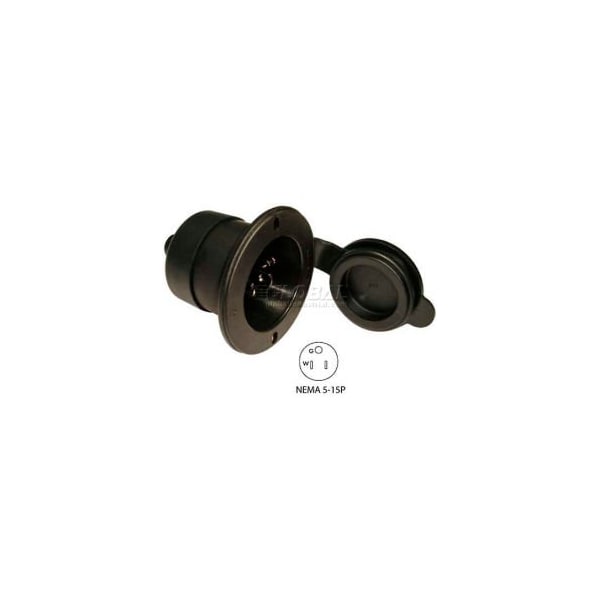 Conntek 80101-bcbk, 15-amp straight blade flanged inlet with nema 5-15p male plug straight blade flanged inlet, 15a 125v, nema 5-15p, 2 pole, 3 wire grounding, nylon casing, back wired .