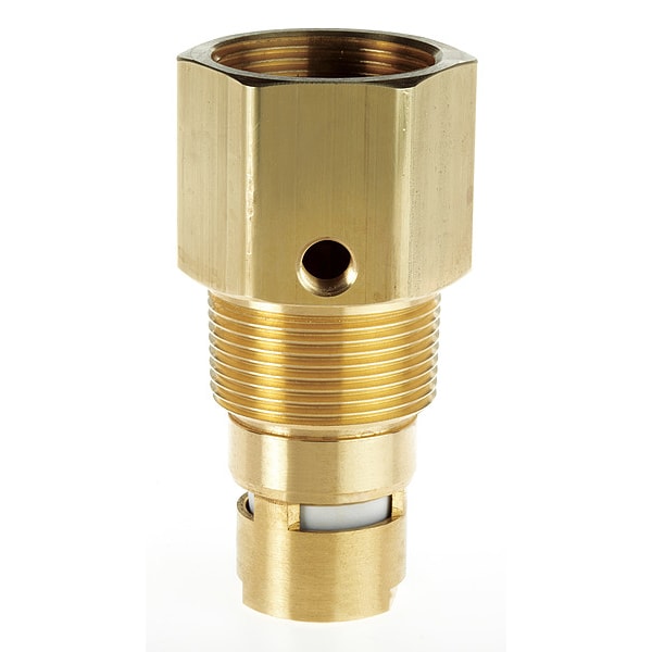 Check Valve, In Tank, Inlet (In.) 1 1/4 in (F)NPT, Outlet (In.) 1 1/4 in (M)NPT, Brass, Max. Pressure (PSI) 500 psi, Cracking Pressure (PSI) 1 psi, Hex Size (In.) 1 7/8 in, Flow Range Free Air (CFM) 95 scfm, Max. Temp. (F) 450 Degrees F, In Tank Mounting, Length (In.) 4 in, Stainless Steel Spring Material, Glass Filled PTFE Poppet, PTFE Seal, In-Tank Check Valve