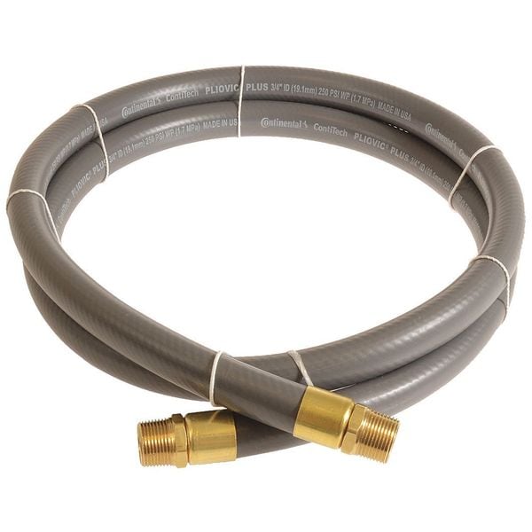 Air Hose, Hose Inside Dia. 1 in, Hose Outside Dia. 1 3/8 in, Hose Length 5 ft, Hose Color Gray, Hose Tube Material PVC, Hose Cover Material PVC, Burst Pressure 1,000 psi, Max. Working Pressure @ 70 F 250 psi, Temp. Range -10 Degrees to 158 Degrees F, Hose Reinforcement Type Spiral, Hose Reinforcement Material Polyethylene, Safety Factor 4:1, Hose Fitting A Material Brass, Hose Fitting B Material Brass, Hose Fitting A Type MNPT, Hose Fitting B Type MNPT, Hose Fitting A Size 1 in