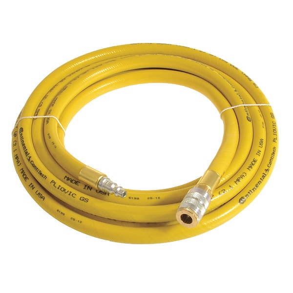 Air Hose, Hose Inside Dia. 3/4 in, Hose Outside Dia. 1 1/8 in, Hose Length 75 ft, Hose Color Yellow, Hose Tube Material PVC, Hose Cover Material PVC, Burst Pressure 1,000 psi, Max. Working Pressure @ 70 F 250 psi, Temp. Range -10 Degrees to 158 Degrees F, Hose Reinforcement Type Spiral, Hose Reinforcement Material Polyethylene, Safety Factor 4:1, Hose Fitting A Material Carbon Steel, Hose Fitting B Material Brass, Hose Fitting A Type M Quick Disconnect, Hose Fitting B Type F Quick Disconnect