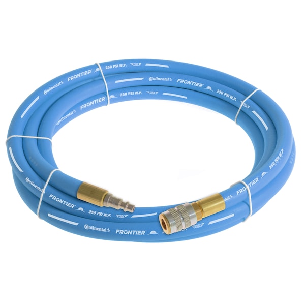 Blue Multipurpose Rubber Air Hose, 250 PSI, Coupled Assembly, 3/8 in. ID, 15ft. length, 1/4 in. Industrial Plug x 1/4 in. Industrial Socket Fittings, Temp. Range -40 to 210 Degrees F, Tube Material EPDM, Cover Material EPDM, Spiral Synthetic Yarn Reinforcement