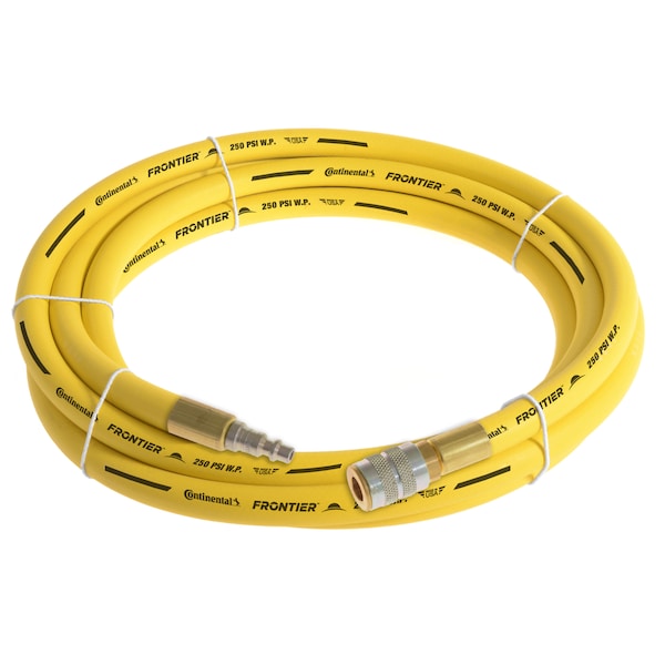 Yellow Multipurpose Rubber Air Hose, 250 PSI, Coupled Assembly, 3/8 in. ID, 20ft. length, 1/4 in. Industrial Plug x 1/4 in. Industrial Socket Fittings, Temp. Range -40 to 210 Degrees F, Tube Material EPDM, Cover Material EPDM, Spiral Synthetic Yarn Reinforcement