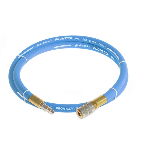 Blue Multipurpose Rubber Air Hose, 250 PSI, Coupled Assembly, 3/8 in. ID, 5ft. length, 1/4 in. Industrial Plug x 1/4 in. Industrial Socket Fittings, Temp. Range -40 to 210 Degrees F, Tube Material EPDM, Cover Material EPDM, Spiral Synthetic Yarn Reinforcement