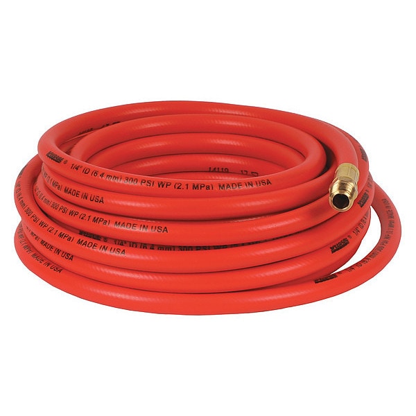 Air Hose, Hose Inside Dia. 1/4 in, Hose Outside Dia. 1/2 in, Hose Length 25 ft, Hose Color Orange, Hose Tube Material TPE, Hose Cover Material TPE, Max. Working Pressure @ 70 F 300 psi, Temp. Range -40 Degrees to 158 Degrees F, Standards RMA Class B, Safety Factor 4:1, Hose Fitting A Material Brass, Hose Fitting B Material Brass, Hose Fitting A Type MNPT, Hose Fitting B Type MNPT, Hose Fitting A Size 1/4 in, Hose Fitting B Size 1/4 in, Hose Configuration Coupled Assembly