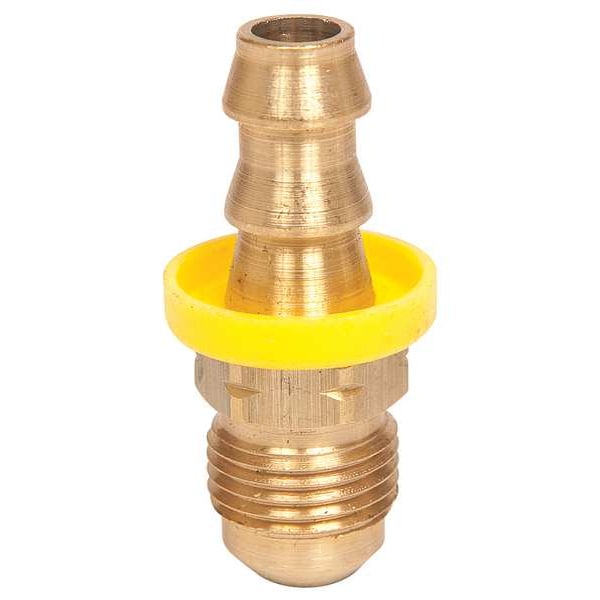 Push-On Hose Fitting, For Hose I.D. 3/8 in, Barb Size 3/8 in, Rigid, Fitting Shape Straight, Hex Head Size 5/8 in, Hose Fitting A Gender Male, Hose Fitting B Gender Male, Hose Fitting A Size 3/8 in, Hose Fitting B Size 3/8 in, Hose Fitting A Connection Type JIC, Hose Fitting B Connection Type Hose Barb, Fitting Material Brass x Brass, Reusable Yes, 4,000 psi