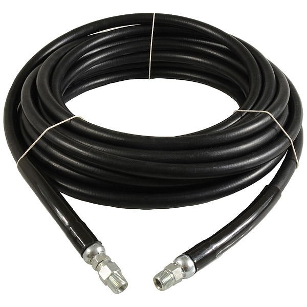 Pressure Washer Hose, Hose Inside Dia. 3/8 in, Hose Outside Dia. 0.69 in, Hose Length 100 ft, Hose Color Black, Hose Tube Material Synthetic Rubber, Hose Cover Material Nitrile, Max. Working Pressure @ 70 F 6,000 psi, Temp. Range -20 Degrees to 250 Degrees F, Standards RMA Class B, Hose Fitting A Material Carbon Steel, Hose Fitting B Material Carbon Steel, Hose Fitting A Type MNPT, Hose Fitting B Type MNPT Swivel, Hose Fitting A Size 3/8 in, Hose Fitting B Size 3/8 in