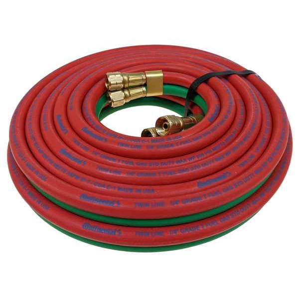 Twin Line Welding Hose, Hose Inside Dia. 1/4 in, Hose Outside Dia. 1/2 in, Hose Length 25 ft, Hose Color Green, Red, Hose Tube Material Synthetic Rubber, Hose Cover Material Nitrile, Hose Reinforcement Type Spiral, Hose Reinforcement Material Fiber, Burst Pressure 800 psi, Max. Working Pressure @ 70 F 200 psi, Temp. Range -40 Degrees to 120 Degrees F, Standards ARPM IP-7, CGA E-1, Safety Factor 4:1, Hose Configuration Coupled Assembly, Hose Grade T, Hose Fitting A Material Brass