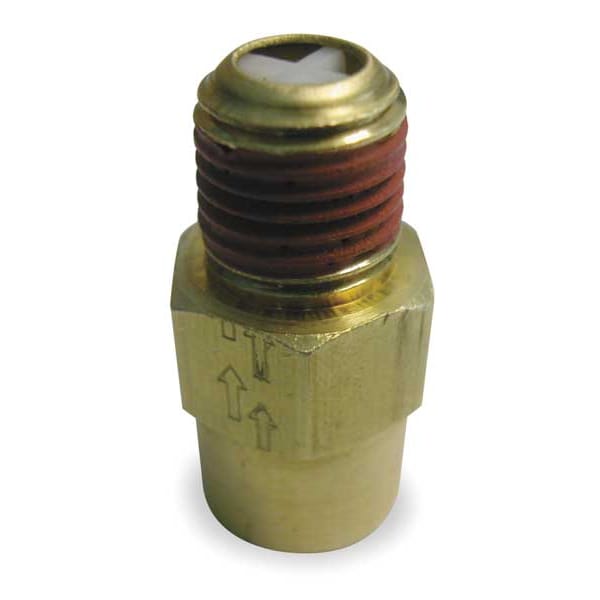 Check Valve, In Line, Inlet (In.) 1/4 in FPT, Outlet (In.) 1/4 in (M)NPT, Brass, Max. Pressure (PSI) 250 psi, Cracking Pressure (PSI) 0.1 psi, Hex Size (In.) 11/16 in, Flow Range Free Air (CFM) 9 scfm, Max. Temp. (F) 250 Degrees F, Horizontal, Vertical Mounting, Length (In.) 1 7/16 in, Stainless Steel Spring Material, Stainless Steel Poppet, Small Air Compressors/Components in Pneumatic Circuit