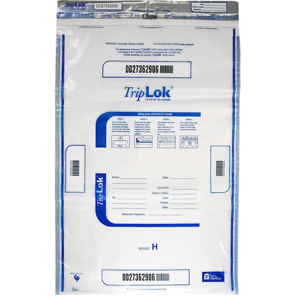 High-Performing Security Bags for banking help reduce losses from theft while, at the same time, improving efficiency of your vault and cash transport operations. Patented, triple-seal closure with interior adhesive leaves no openings once sealed. High-visibility void message reveals tampering attempts. Aqua detect ink reveals exposure to fluids. Special thermochromic ink turns red when subjected to heat. Security microperforation immediately reveals attempts to pull closure up. Anti-static liner does not cling to hands and clothes, speeding up processing. Large serial numbers and bar codes allow easy tracking via CCTV. Security border and micro printing prevent cutting and resealing. Bags are made of polyethylene.