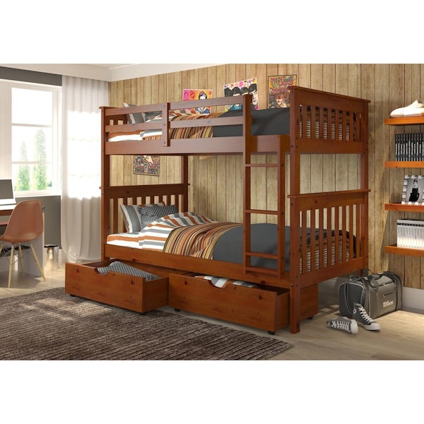 PD-120-3E-TT-505 Mission Twin Over Twin Bunk Bed with Dual Storage Drawers, Light Espresso
