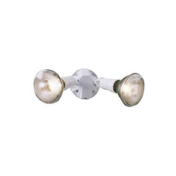 White, Plastic, Outdoor, Twin Flood Light, With Light Sensor, Automatically Turns On At Dusk Off At Dawn, Weatherproof Corrosion Resistant, For Wall Or Eave Mount Applications, PreAssembled PreWired For Easy Installation, Uses Bulb Type Par 38 Incandescent, 120130V, 150W Maximum, Not Included
