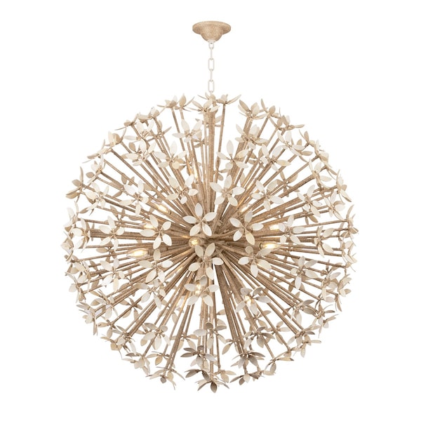 A delicate botanical motif gives this contemporary Sputnik design an organic twist, while intertwining couture artistry. Corfus soft, wispy petals sprout from a central point, creating a burst of light and life. Natural materials like bleached abaca and coco shells impart a neutral tonality and airy quality. As a semi-flush mount in two sizes or a chandelier in three sizes, Corfu is a whimsical delight for the senses.