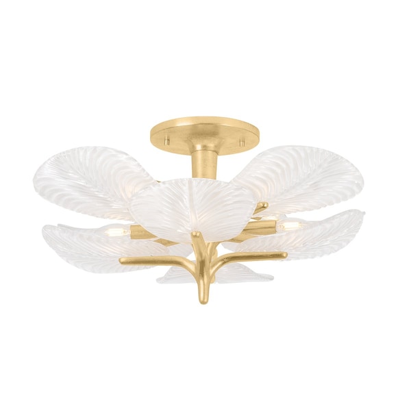 The layered botanical design of the Kamal semi-flush mount adds a pop of freshness overhead. Beautiful leaf patterns have been etched onto each piece of textured glass, creating a dynamic wave-like outward diffusion of light. The candelabra cluster positioned just beneath the ceiling canopy casts light through the layers to create a warm glow around the room. Available in two sizes and finished in Vintage Gold Leaf, Kamal makes a fresh statement in hallways, bedrooms, and beyond.