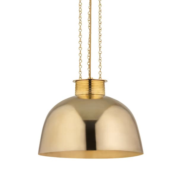 Suspended by three delicate decorative chains, this large-scale dome fixture is designed to bring refinement to everyday spaces. The allover Vintage Brass finish is refined and reflective, while the textured metal bangle hardware gives the silhouette a jewelry-like feel. Available in two sizes, Perseus makes a bold, dynamic impression in modern spaces.