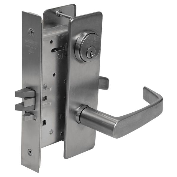 Lever Lockset, Mortise, Institutional, Healthcare, Schools, ML2001 Series, Right Angle, Flat, Escutcheon Style, Satin Chrome Finish, Function Classroom Intruder, Keyway Type L4, Grade 1, Material Heavy Guage Steel, Stainless Steel, Brass, Bronze, For Door Thickness 1-3/4 In., Backset 2-3/4 In., Front Size Dimension 8 x 1-1/4 In., Key Type Nickel Silver, Number of Keys 2, Pins 6, ANSI 4-7/8 x 1-1/4 In. Curved Lip Strike, Cylinder Yes, No Deadbolt, Keying Different