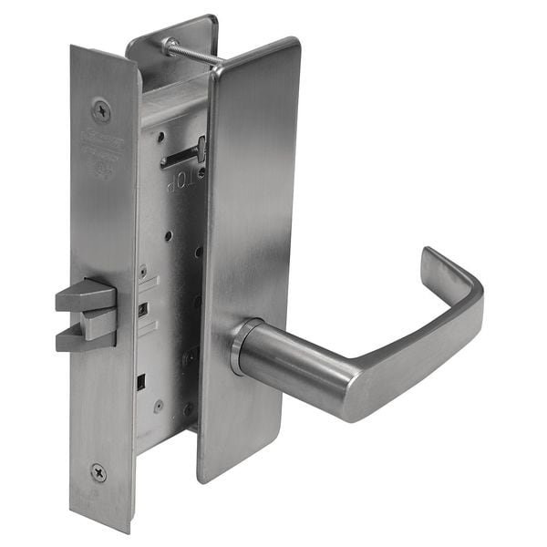 Lever Lockset, Mortise, Institutional, Healthcare, Schools, ML2001 Series, Right Angle, Flat, Escutcheon Style, Satin Chrome Finish, Function Passage, Grade 1, Material Heavy Guage Steel, Stainless Steel, Brass, Bronze, For Door Thickness 1-3/4 In., Backset 2-3/4 In., Front Size Dimension 8 x 1-1/4 In., ANSI 4-7/8 x 1-1/4 In. Curved Lip Strike, No Deadbolt, Standards Meets A156.13 Series 1000, Operational and Security Grade 1, Meets A117.1 Accessiblity Code, California State Reference Code