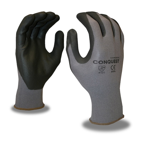 Nitrile is an oil-resistant, synthetic rubber that is abrasion-, snag-, and puncture-resistant. Machine knit, nitrile-coated gloves are incredibly durable and offer excellent sense of touch. Foam nitrile coatings are porous, which channels oil away from the glove surface for a secure grip in light oil applications. This Cordova Safety Products-brand Conquest glove features a 15-gauge, gray, nylon/spandex shell and black, micro-foam nitrile/polyurethane PU palm coating. View all Conquest gloves. View all nitrile-coated machine-knit gloves. Sold in 12 pairs