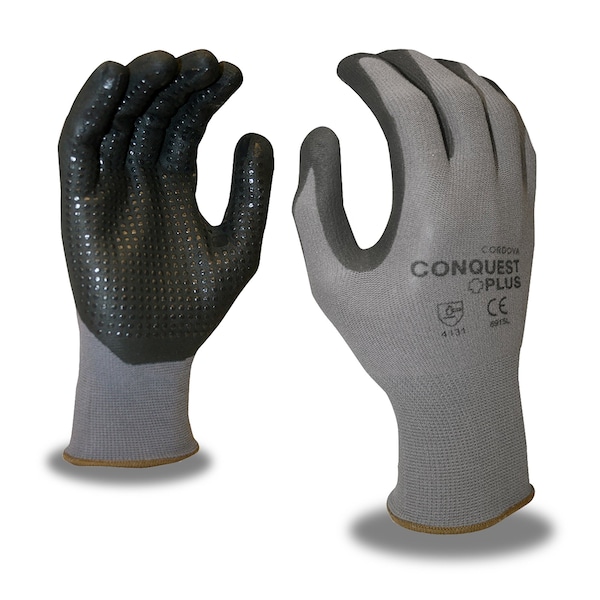 Nitrile is an oil-resistant, synthetic rubber that is abrasion-, snag-, and puncture-resistant. Machine knit, nitrile-coated gloves are incredibly durable and offer excellent sense of touch. Foam nitrile coatings are porous, which channels oil away from the glove surface for a secure grip in light oil applications. This Cordova Safety Products-brand Conquest Plus glove features a 15-gauge, gray, nylon/spandex shell and black, foam nitrile/polyurethane PU palm coating with nitrile dots for extra grip. View all Conquest gloves. Sold in 12 pairs