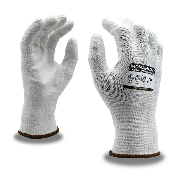 Cordova Safety Products-brand MONARCH high-performance, engineered fiber gloves are constructed of a versatile, multi-filament yarn that combines high-strength fiber, fiberglass and synthetic fibers to provide excellent abrasion, cut and contact-heat resistance. The MONARCH PU glove features a white, 13-gauge, spun high-performance shell, white polyurethane PU palm coating, and an A3 cut level. MONARCH gloves are easy to launder and unaffected by chlORe bleach and UV light