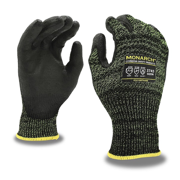 Cordova Safety Products-brand MONARCH high-performance, engineered fiber gloves are constructed of a versatile, multi-filament yarn that combines high-strength fiber, fiberglass and synthetic fibers to provide excellent abrasion, cut and contact-heat resistance. The MONARCH SOFT glove features a 13-gauge, soft, spun engineer fiber shell, black polyurethane PU palm coating, and an A4 cut level. MONARCH gloves are easy to launder and unaffected by chlORe bleach and UV light