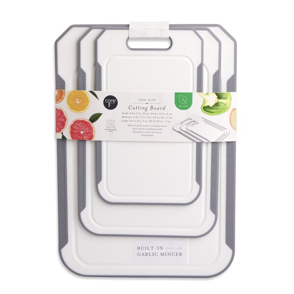 Non-slip cutting board has a built-in garlic mincer on larger board. Has a juice well for catching liquids. Resistant to odors and stains. Has a easy-grip handle