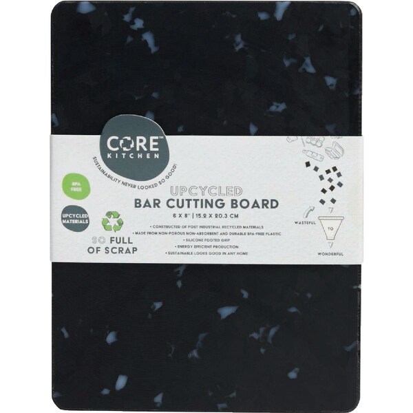 This upcycled bar cutting board is constructed of post industrial recycled materials. It is made from non-porous non-absorbent and durable BPA-Free plastic. It has a silicone footed grip to prevent the board from sliding. This product is sustainable with energy efficient production