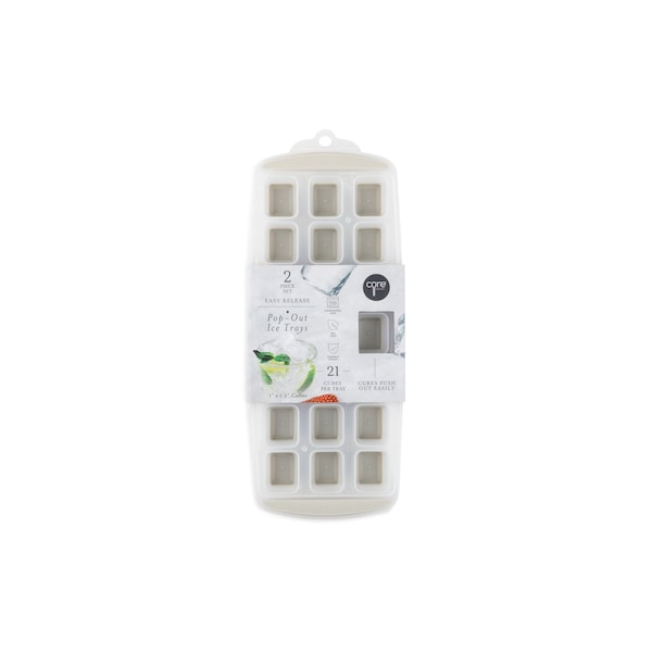 Easy release pop-out ice trays have 21 cubes per tray. Mini sied cubes are ideal for bottles with smaller openings. Use for ice, frozen desserts, chocolates and more. Stackable design for easy storage.
