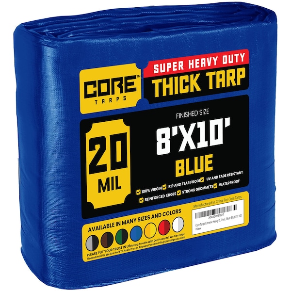 Heavy Duty Tarp, 10 ft L x 0.5 mm H x 8 ft W, 20 Mil, Blue, Polyethylene