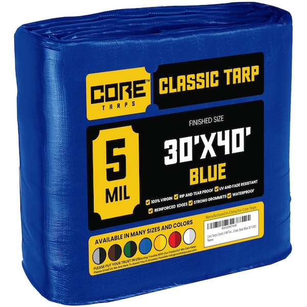 Heavy Duty Tarp, 40 ft L x 0.5 mm H x 30 ft W, 5 Mil, Blue, Polyethylene