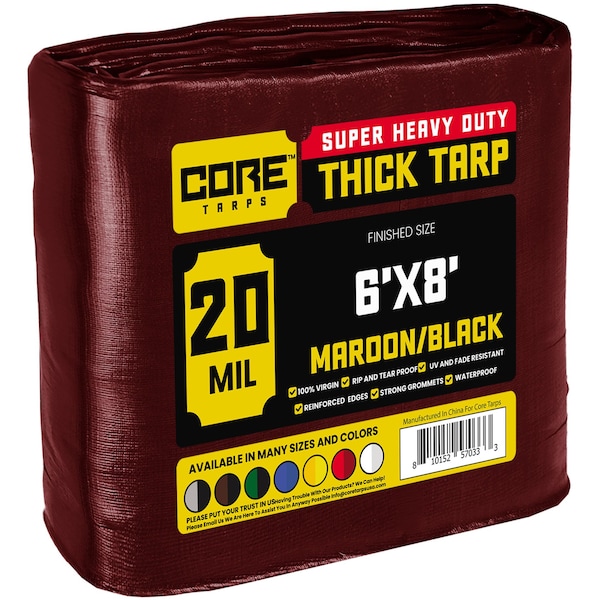 Heavy Duty Tarp, 6 ft x 8 ft, 20 Mil, Maroon, Polyethylene
