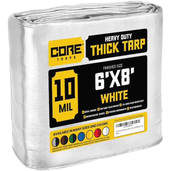 Heavy Duty Tarp, 8 ft L x 0.5 mm H x 6 ft W, 10 Mil, White, Polyethylene