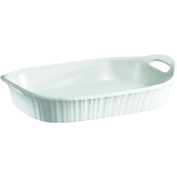 BAKING DISH FRENCH WHITE 3QTIntegrated handles at either end. Stoneware is oven, microwave, refrigerator, freezer and dishwasher-safe. Non-porous surface does not absorb food odors, flavors or stains.