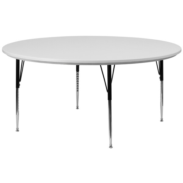 Correll Heavy Duty Blow Molded Classroom Activity Table. 60" round top. Light weight and virtually indestructible Gray Granite one piece blow molded plastic top. Light weight water-proof blow molded plastic has color that go all the way through, will not wear or scratch off. Its also scratch and impact resistant. Height adjustable from 19" to 29" in 1" increments (perfect for kindergarten to adult) Speedwrench included for fast and secure height adjustments. Strong integrated free standing welded steel frame. Legs attach to the frame with 3 bolts each (socket wrench required) Black T-Mold edging and black and chrome legs. Tables are custom built to order. YOU CAN COUNT ON CORRELL: Correll was established in 1969 and has been in business for over 50 years. With our outstanding Standing Customer Service, innovative new product lines, and the largest selection of Folding Tables available from any manufacturer, now, more than ever, you can count on Correll.