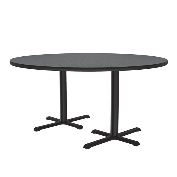 Correll Café, & Break Room Tables. Built for the harsh demands of Commercial use. 60" Montana Granite Round high pressure laminate Top. Laminate surface resists scratches and stains and offers a hard, flat surface. Top also features a Backer sheet on underside of table that helps protect against moisture entering the underside of the table causing warping. Black textured cast iron spider and cross base with a steel column for strength and durability. Bases include nylon leveling guides for study placement. Black T-Mold edges provide protection to both the table and your walls. Meets BIFMA Standards. . YOU CAN COUNT ON CORRELL: Correll was established in 1969 and has been in business for over 50 years. With our out Standing Customer Service, innovative new product lines, and the largest selection of Folding Tables available from any manufacturer, now, more than ever, you can count on Correll.