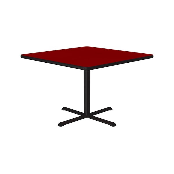 Correll Café, & Break Room Tables. Built for the harsh demands of Commercial use. Standard 29" high table. 42" Square Red high pressure laminate Top. Laminate surface resists scratches and stains and offers a hard, flat surface. Top also features a Backer sheet on underside of table that helps protect against moisture entering the underside of the table causing warping. Black textured cast iron spider and X-base with 3" steel column for strength and durability. Bases include nylon leveling guides for study placement. Black T-Mold edges provide protection to both the table and your walls. Meets BIFMA Standards. . YOU CAN COUNT ON CORRELL: Correll was established in 1969 and has been in business for over 50 years. With our out Standing Customer Service, innovative new product lines, and the largest selection of Folding Tables available from any manufacturer, now, more than ever, you can count on Correll.