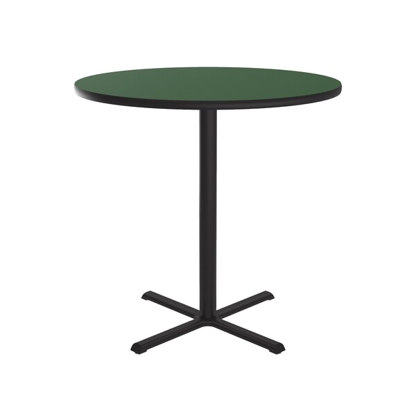 Correll Café, & Break Room Tables. Built for the harsh demands of Commercial use. These 42" bar height tables are the perfect height for standing or use with stools. 42" round Green Rectangular high pressure laminate Top. Laminate surface resists scratches and stains and offers a hard, flat surface. Top also features a Backer sheet on underside of table that helps protect against moisture entering the underside of the table causing warping. Black textured cast iron spider and X-base with 3" steel column for strength and durability. Bases include nylon leveling guides for study placement. Black T-Mold edges provide protection to both the table and your walls. Meets BIFMA Standards. . YOU CAN COUNT ON CORRELL: Correll was established in 1969 and has been in business for over 50 years. With our out Standing Customer Service, innovative new product lines, and the largest selection of Folding Tables available from any manufacturer, now, more than ever, you can count on Correll.