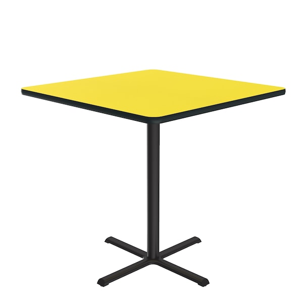Correll Café, & Break Room Tables. Built for the harsh demands of Commercial use. These 42" bar height tables are the perfect height for standing or use with stools. 42" Square Yellow Rectangular high pressure laminate Top. Laminate surface resists scratches and stains and offers a hard, flat surface. Top also features a Backer sheet on underside of table that helps protect against moisture entering the underside of the table causing warping. Black textured cast iron spider and X-base with 3" steel column for strength and durability. Bases include nylon leveling guides for study placement. Black T-Mold edges provide protection to both the table and your walls. Meets BIFMA Standards. . YOU CAN COUNT ON CORRELL: Correll was established in 1969 and has been in business for over 50 years. With our out Standing Customer Service, innovative new product lines, and the largest selection of Folding Tables available from any manufacturer, now, more than ever, you can count on Correll.